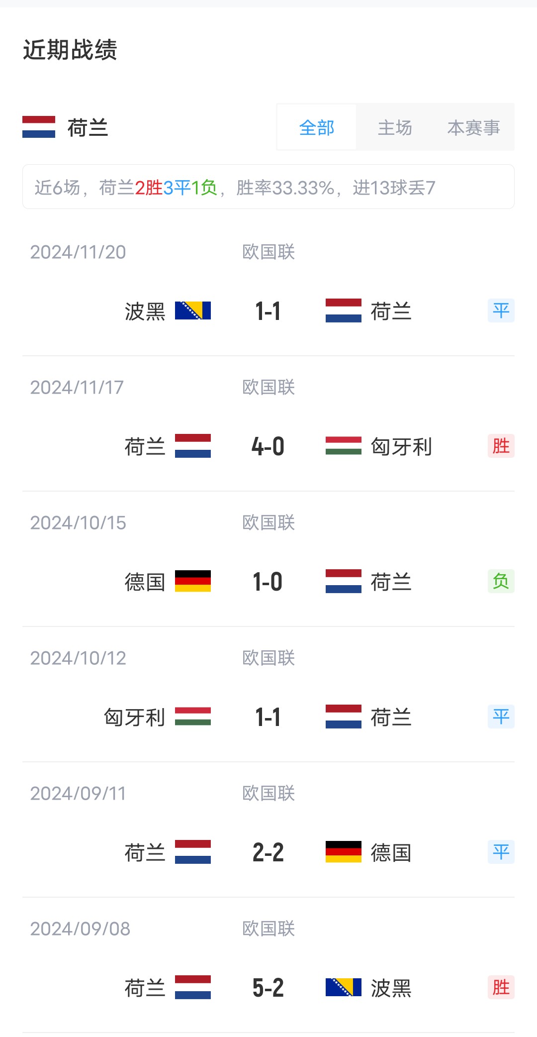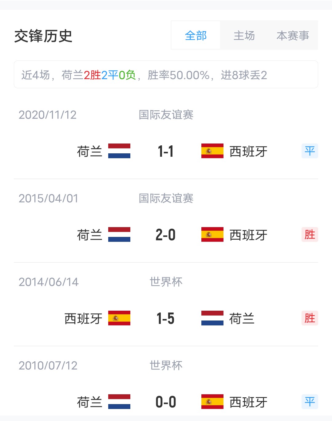雙方近4場交鋒,荷蘭取得2勝2平的戰(zhàn)績稍居上風。