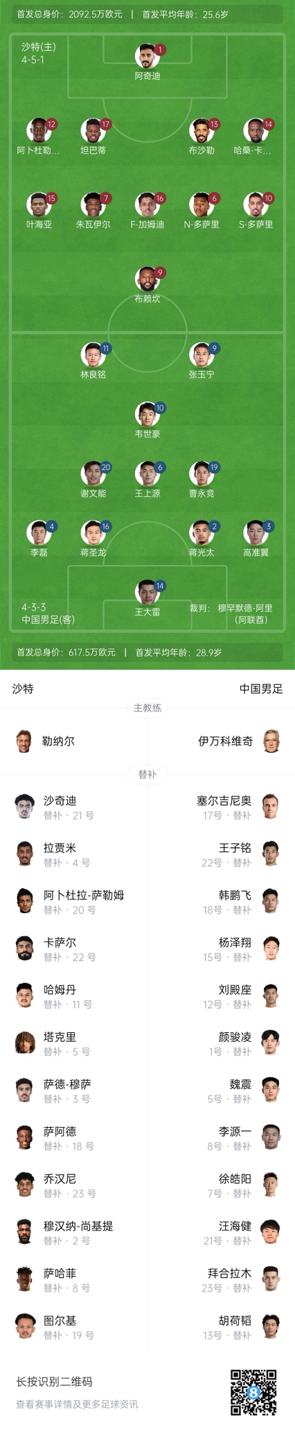 - 世預(yù)賽-國足vs沙特首發(fā):張玉寧、韋世豪、王上源出戰(zhàn),塞鳥替補