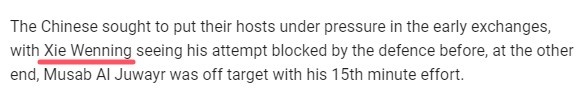 亞足聯(lián)官網(wǎng)在報(bào)道本場(chǎng)比賽時(shí)鬧出烏龍,他們?cè)趹?zhàn)報(bào)中將國(guó)足中場(chǎng)謝文能的拼音名“Xie Wenneng”寫(xiě)為了“Xie Wenning”。