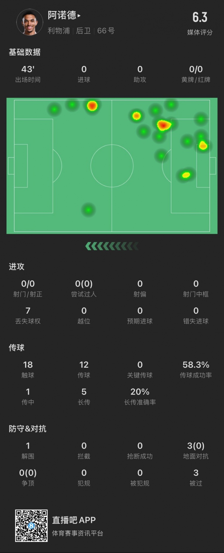 3月6日訊 歐冠1/8決賽首回合焦點戰(zhàn),巴黎主場對陣?yán)锲帧0雸鰬?zhàn)罷,兩隊暫時0-0平。上半場,阿諾德多次被過,多項關(guān)鍵數(shù)據(jù)掛零,評分6.3全場第二低。