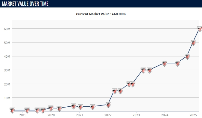 桑謝特在場上司職進攻型中場,2015年加入畢爾巴鄂青訓(xùn),2020年正式進入一線隊。近年來桑謝特的身價一直穩(wěn)步上升,過去半年他的身價已經(jīng)連續(xù)兩次上漲1000萬歐。