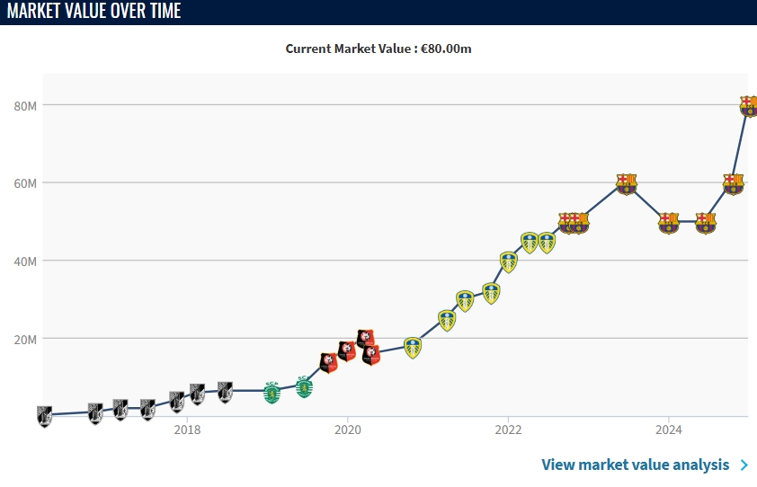 本賽季28歲的拉菲尼亞狀態(tài)優(yōu)異,各賽事42場比賽打進(jìn)27球,并有20次助攻,場均制造一球的同時(shí)也幫助巴薩多線爭冠,創(chuàng)造生涯最佳表現(xiàn)的他身價(jià)卻與去年12月份相同,仍為8000萬歐元。