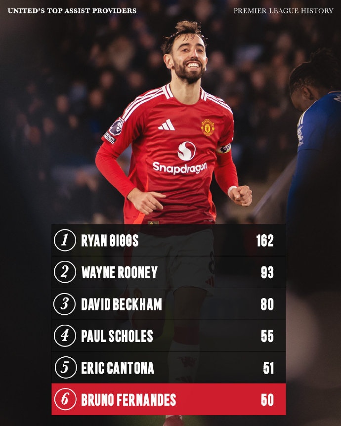 3月21日訊 曼聯(lián)社媒曬出隊(duì)內(nèi)英超歷史助攻榜,吉格斯162次助攻斷層第一,B費(fèi)50次助攻進(jìn)入前六。