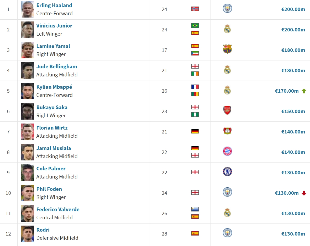 - 合理嗎?世界前十身價(jià):哈蘭德&維尼修斯2億第1,福登1.3億仍前10