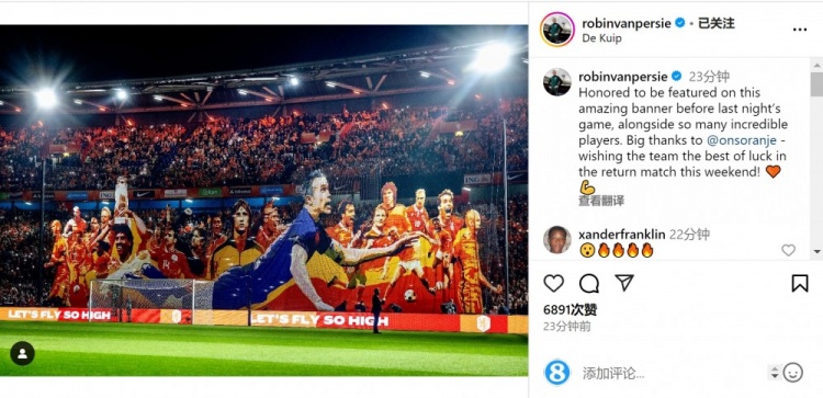 范佩西在社交媒體上曬出TIFO的照片,配文:“很榮幸能在昨晚的比賽前與這么多出色的球員一起出現(xiàn)在這幅令人驚嘆的橫幅上,非常感謝荷蘭隊——祝球隊在本周末的次回合比賽中好運!”