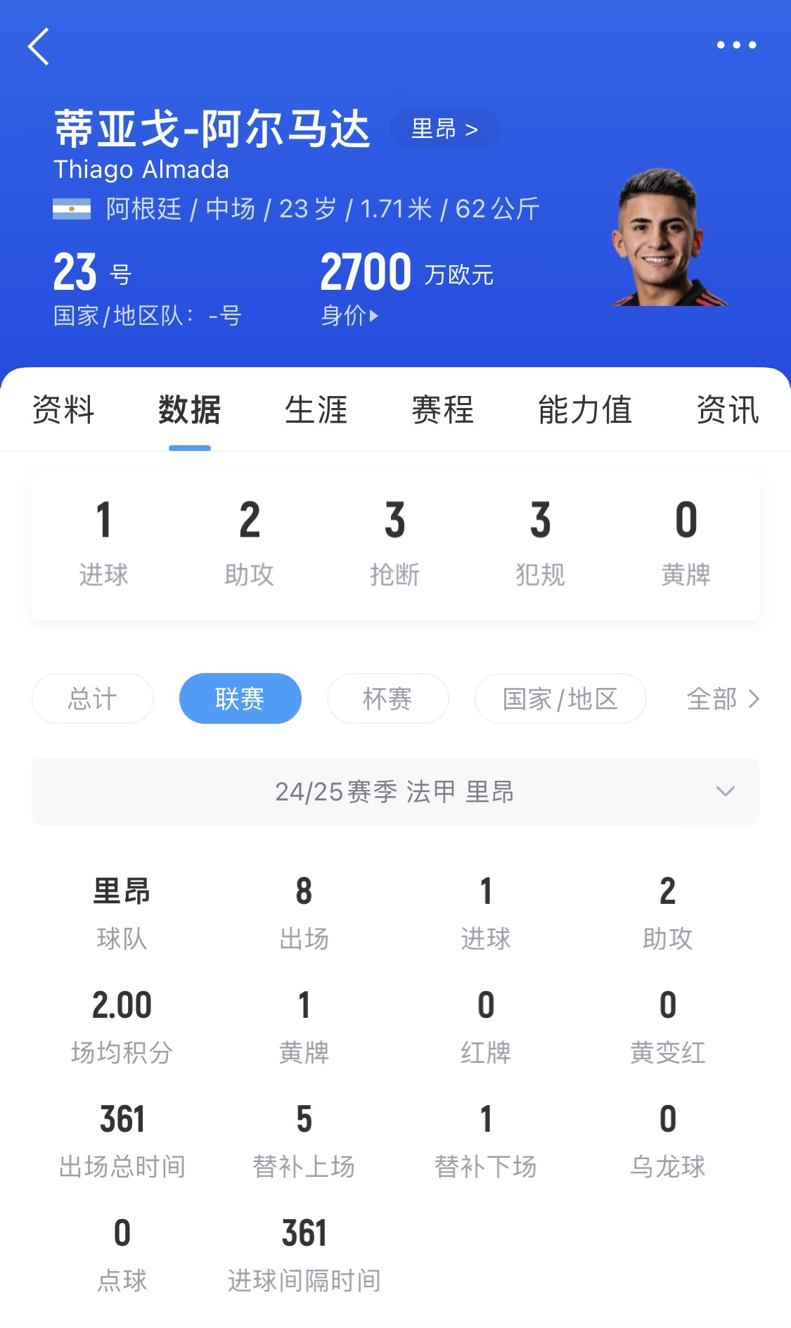 23歲的阿爾馬達(dá)今年租借里昂,3月16日剛收獲法甲首球,近兩場(chǎng)法甲1球2助,球員目前身價(jià)為2700萬(wàn)歐。