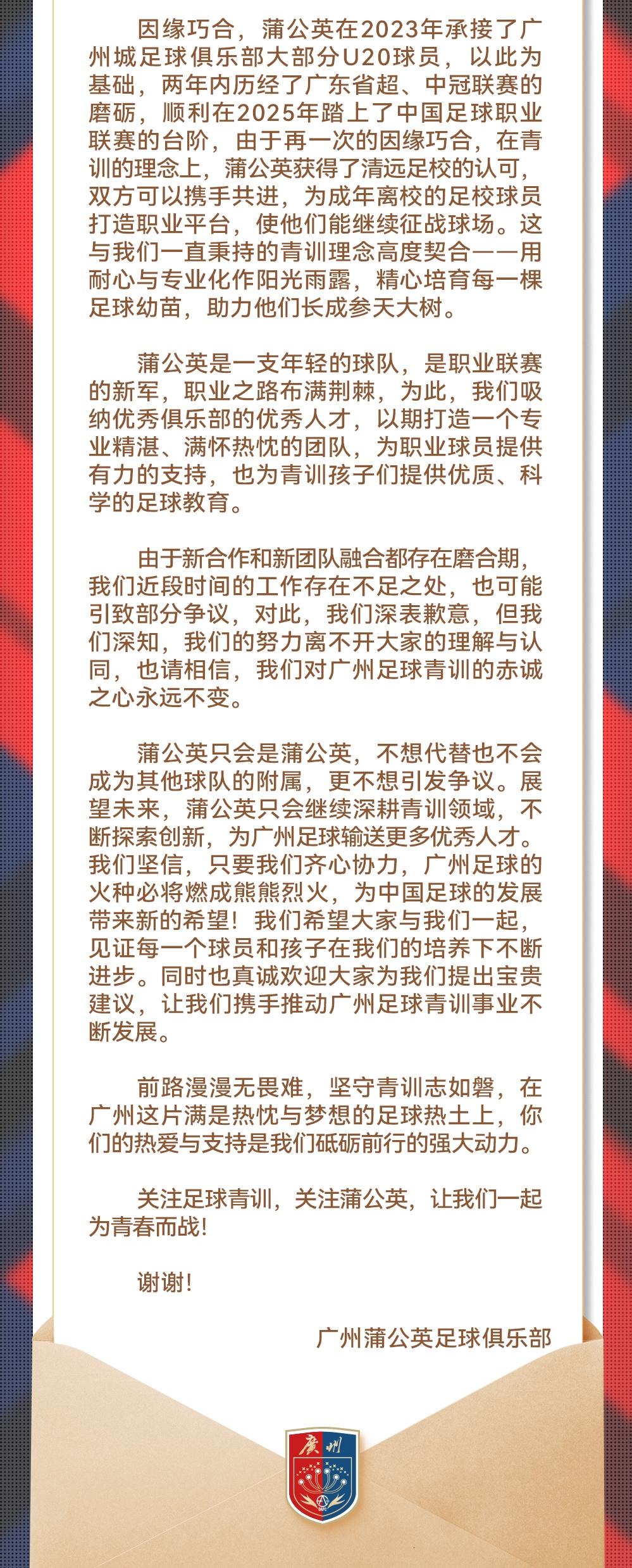 蒲公英只會是蒲公英,不想代替也不會成為其他球隊的附屬,更不想引發(fā)爭議。展望未來,蒲公英只會繼續(xù)深耕青訓領域,不斷探索創(chuàng)新,為廣州足球輸送更多優(yōu)秀人才。我們堅信,只要我們齊心協(xié)力,廣州足球的火種必將燃成熊熊烈火,為中國足球的發(fā)展帶來新的希望!我們希望大家與我們一起,見證每一個球員和孩子在我們的培養(yǎng)下不斷進步,同時也真誠歡迎大家為我們提出寶貴建議,讓我們攜手推動廣州足球青訓事業(yè)不斷發(fā)展。