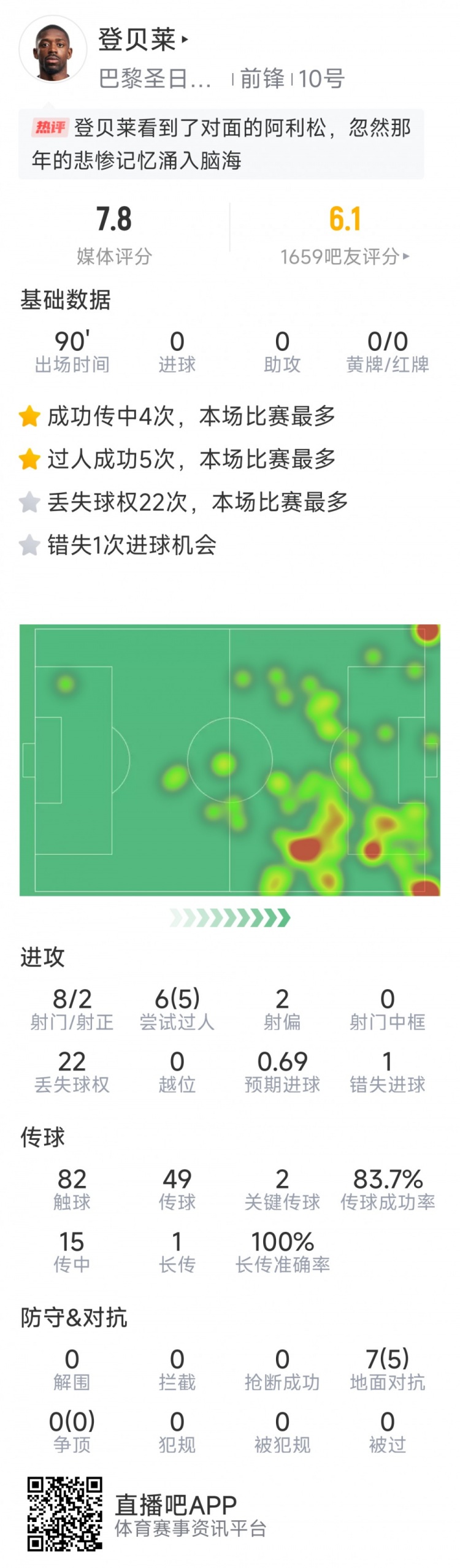 3月6日訊 在本輪歐冠,巴黎0-1不敵利物浦。本場比賽登貝萊首發(fā)登場,以下為他在本場數(shù)據(jù):