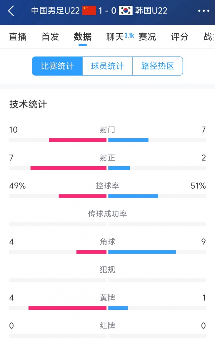- U22國足1-0韓國全場數據:控球率49%落后韓國,10射7正領先對手