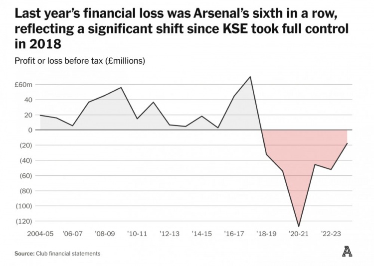 在2018年之后,阿森納連續(xù)六年出現(xiàn)財(cái)務(wù)虧損,也體現(xiàn)了阿森納財(cái)務(wù)所有權(quán)重大轉(zhuǎn)變后的影響