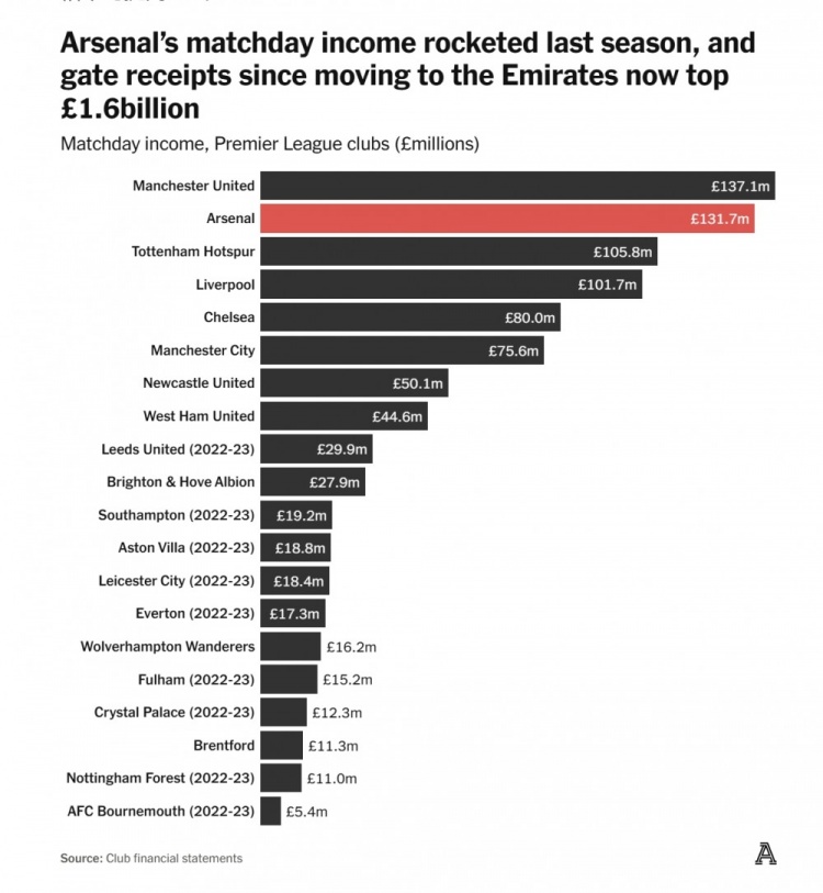 所以,那個(gè)賽季阿森納拿下了單賽季隊(duì)史最高門(mén)票收入,國(guó)內(nèi)比賽日收入躍升聯(lián)賽第二位。去年阿森納的比賽日收入僅比曼聯(lián)少了550萬(wàn)英鎊,這也意味著兩隊(duì)之間的差距明顯縮?。捍饲皟蓚€(gè)賽季,兩隊(duì)的比賽日收入都相差超過(guò)3000萬(wàn)英鎊。盡管酋長(zhǎng)球場(chǎng)的建設(shè)成本,可能在過(guò)去幾年里限制了球隊(duì)的發(fā)展,但如今搬遷的好處正在越來(lái)越明顯。