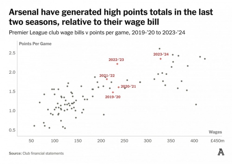 在過(guò)去兩個(gè)賽季中,阿爾特塔治下的阿森納開(kāi)始不斷刷新自己賬單紀(jì)錄。2022/2023賽季,他們以英超第六高的人工成本,拿到了聯(lián)賽亞軍。上個(gè)賽季,他們則是以英超第五高的人工成本,再奪聯(lián)賽亞軍。