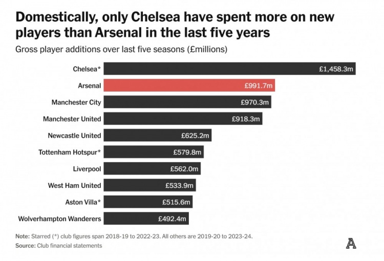 過(guò)去五年,只有切爾西在轉(zhuǎn)會(huì)市場(chǎng)上的投入超過(guò)阿森納