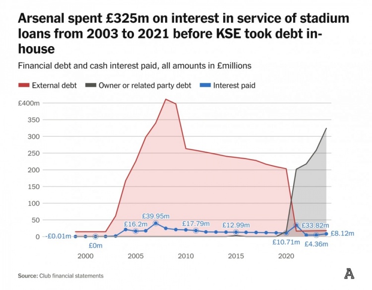 2003年到2021年,KSE內(nèi)部承擔(dān)債務(wù)之前,阿森納在球場(chǎng)貸款利息上花費(fèi)了3.25億英鎊