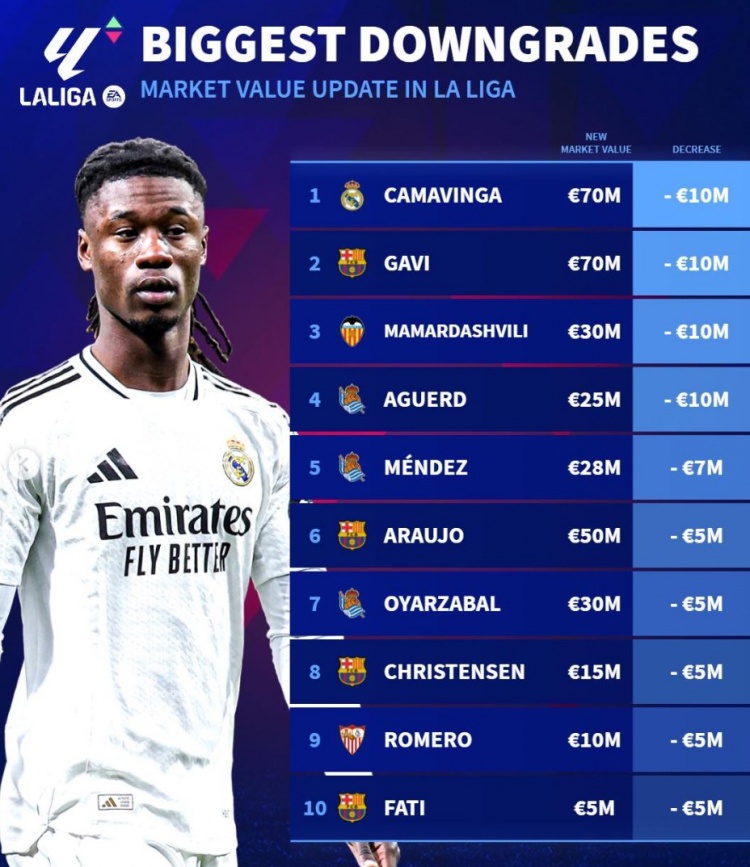 - 西甲身價貶值榜:加維、法蒂領銜巴薩4將,卡馬文加&瑪瑪達在列