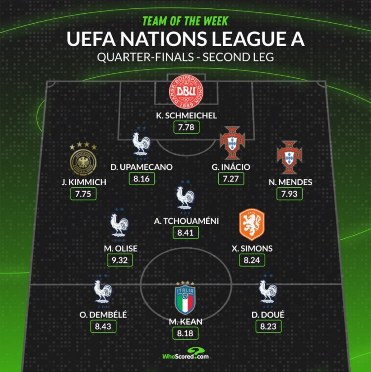 3月24日訊 歐國聯(lián)八強戰(zhàn)次回合已經(jīng)完賽,whoscored也統(tǒng)計了本輪評分最佳陣容,法國隊5將在列。