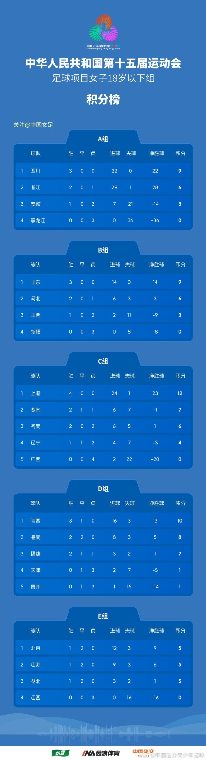 - 全運(yùn)會(huì)女足U18資格賽(CD組)第5輪、(ABE組)第3輪賽果+積分榜