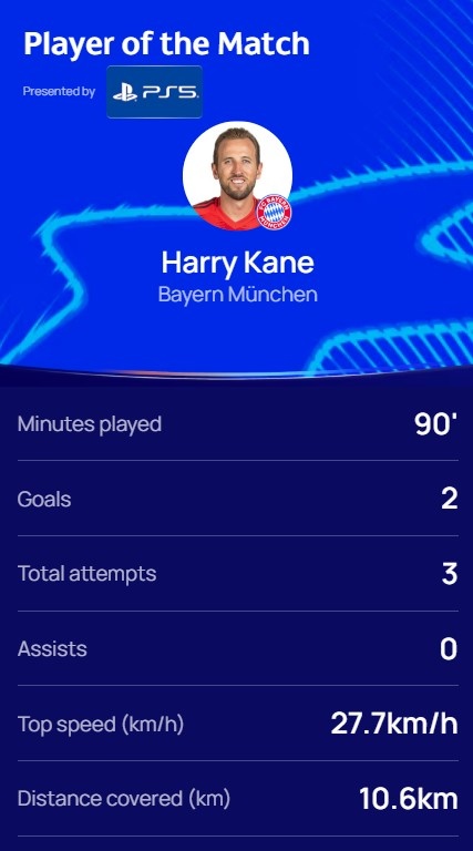 本場比賽凱恩梅開二度,3次射門,跑動距離10.6km,賽后他也當(dāng)選歐冠官方評選的本場最佳球員。