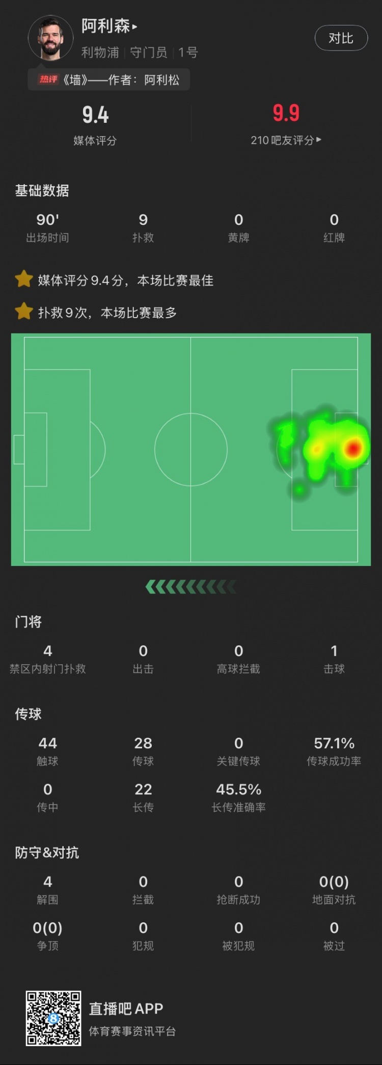 3月6日訊 在剛剛結(jié)束的歐冠1/8決賽中,利物浦1-0絕殺巴黎。本場比賽,巴黎狂轟27腳射門、10腳射正,均被阿利森化解。他獲得了9.4分的評分,全場最高。
