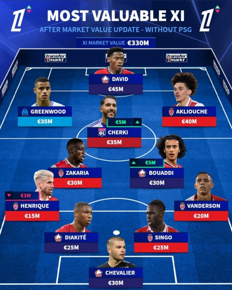不含巴黎球員的法甲身價最高陣容↓