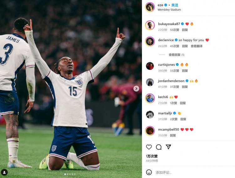 - 同場(chǎng)打進(jìn)英格蘭隊(duì)處子球!里斯-詹姆斯&埃澤社媒曬照紀(jì)念