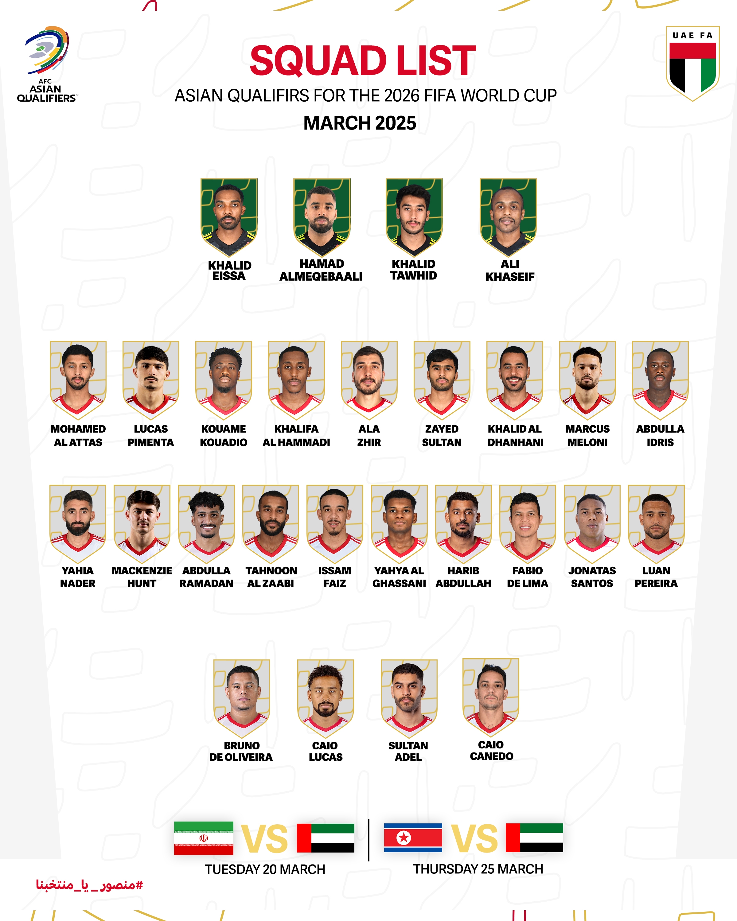 03月06日訊 阿聯(lián)酋公布了3月世預(yù)賽大名單,本月阿聯(lián)酋將于3月21日對陣伊朗,3月26日對陣朝鮮。