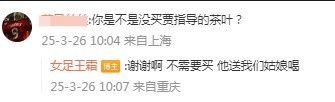有網(wǎng)友在評(píng)論里留言提問(wèn)“你是不是沒(méi)買(mǎi)賈指導(dǎo)的茶葉?”對(duì)此王霜回復(fù)寫(xiě)道:“謝謝啊,不需要買(mǎi),他送我們姑娘喝?!?/p>
