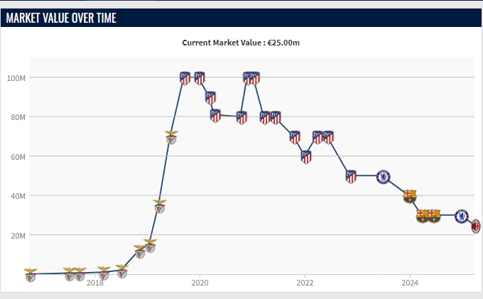 菲利克斯2500萬歐的身價也是2019年之后的新低,菲利克斯2019年巔峰身價曾達(dá)1億歐,在2021年之后身價一直在下降。