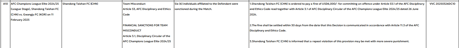 1.山東泰山對陣光州FC時有6人染黃,因違反亞足聯(lián)紀律與道德準則第53.1條以及亞足聯(lián)亞冠精英聯(lián)賽紀律通告第3.1條,被罰款6000美元。