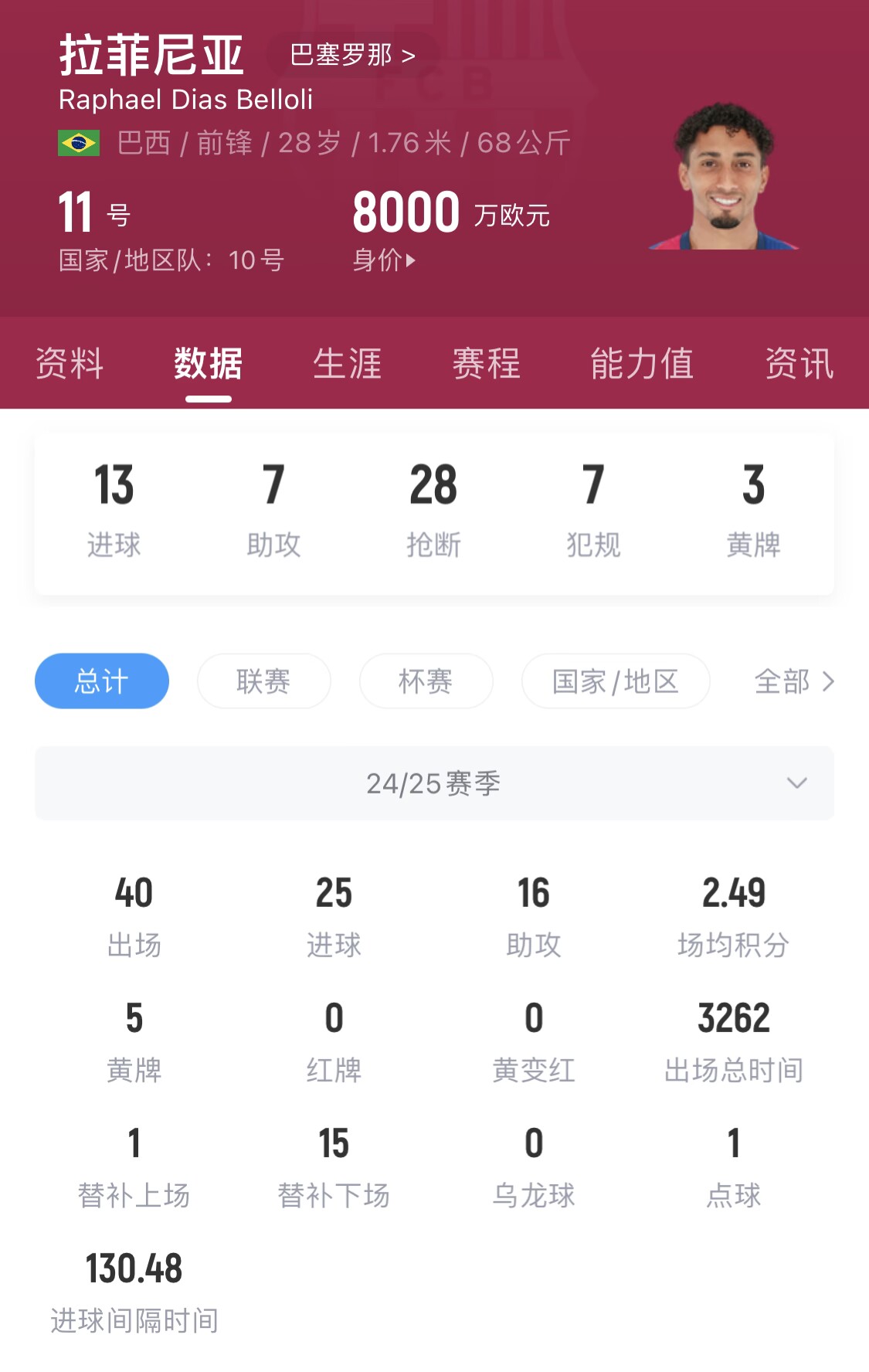 - 實(shí)打?qū)嵉?000萬(wàn)!拉菲尼亞25球16助,金球獎(jiǎng)賠率第3高于維尼修斯