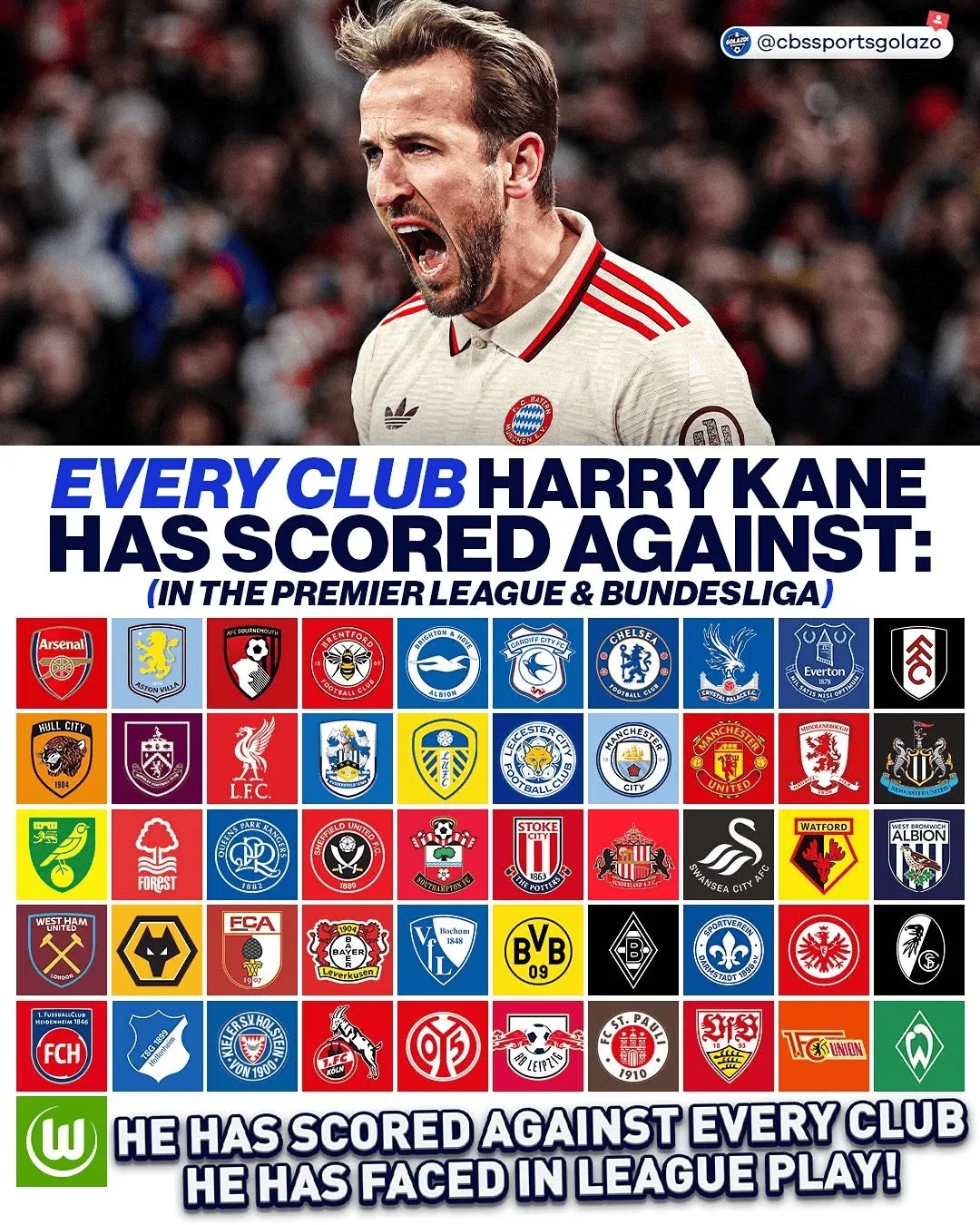 - 通殺,凱恩德甲、英超對陣51家俱樂部均完成破門