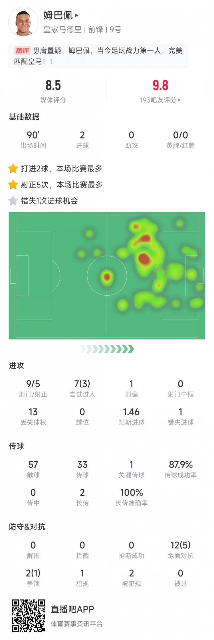 - 貝林數據:1進球,5次過人全成功,14次成功對抗,全場最高9.2分