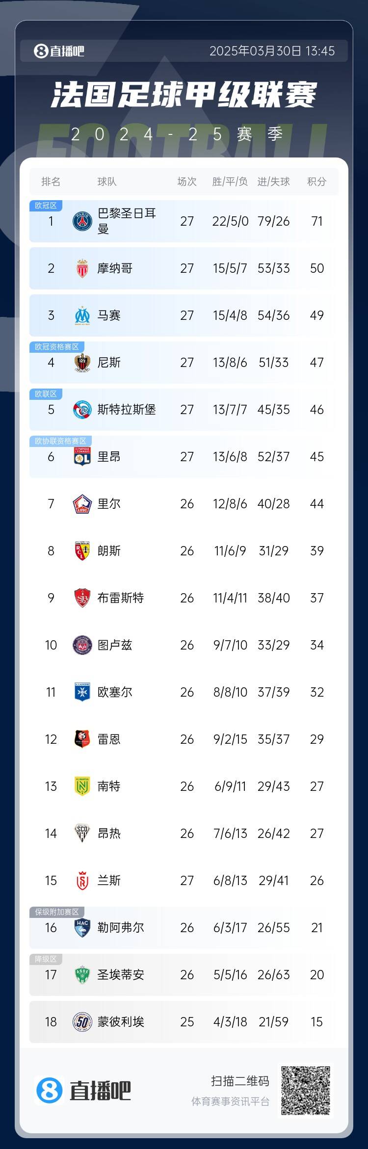 03月30日訊 法甲第27輪,斯特拉斯堡4-2里昂,現(xiàn)已升至法甲第五,距離歐冠區(qū)僅差3分。