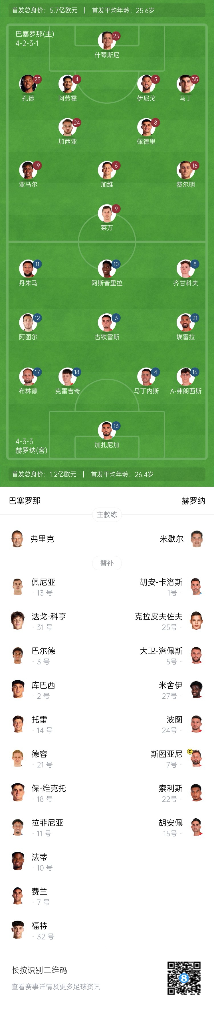 巴薩首發(fā):25-什琴斯尼、4-阿勞霍、5-伊尼戈-馬丁內(nèi)斯、23-孔德、24-埃里克-加西亞、35-杰拉德-馬丁、6-加維、8-佩德里、16-費(fèi)爾明、19-亞馬爾、9-萊萬(wàn)