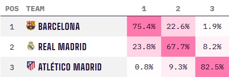 本輪西甲,馬競(jìng)客場(chǎng)1-1戰(zhàn)平西班牙人,賽后多賽距離榜首已有6分之差。數(shù)據(jù)機(jī)構(gòu)Opta給出的最新數(shù)據(jù)顯示,馬競(jìng)本賽季西甲奪冠概率只剩下0.8%,基本可以宣布退出爭(zhēng)冠。