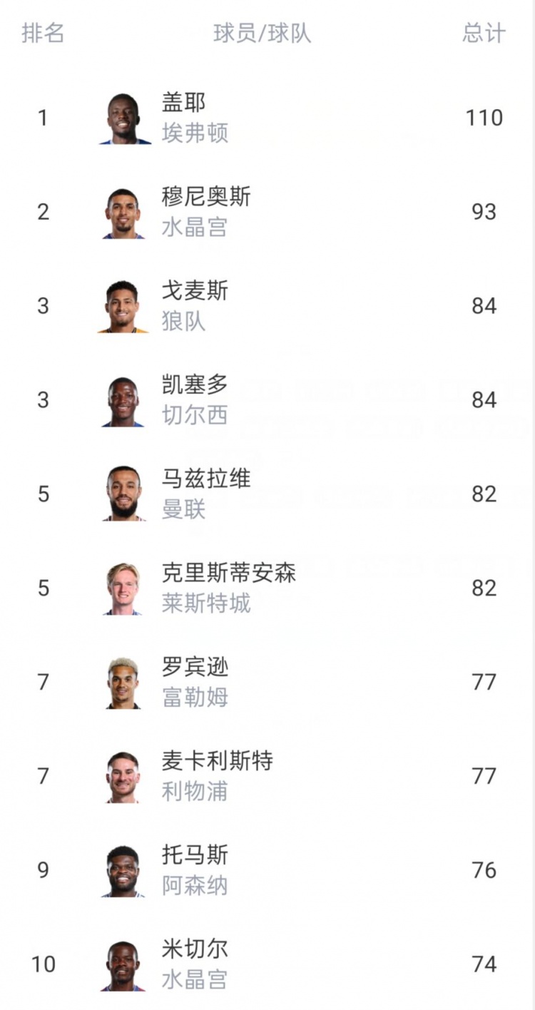 - 110次!埃弗頓中場(chǎng)蓋耶是本賽季英超唯一搶斷次數(shù)超100的球員