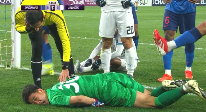 03月05日訊 申花vs川崎比賽第42分鐘,鮑亞雄在沖撞中被對方前鋒馬爾西尼奧蹬到腹部,表情非常痛苦。