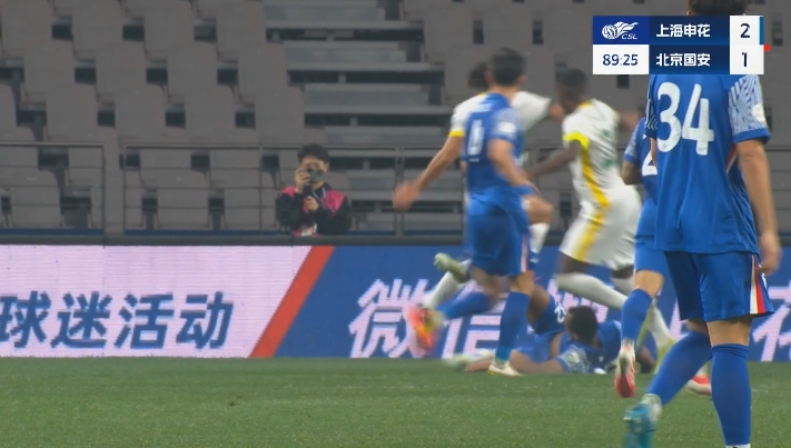 【判例一】:中超聯(lián)賽第2輪,上海申花VS北京國安,比賽第89分鐘,北京國安9號(hào)隊(duì)員在對(duì)方罰球區(qū)內(nèi)與上海申花32號(hào)隊(duì)員爭(zhēng)搶球后倒地,裁判員未判罰犯規(guī),VAR未介入。