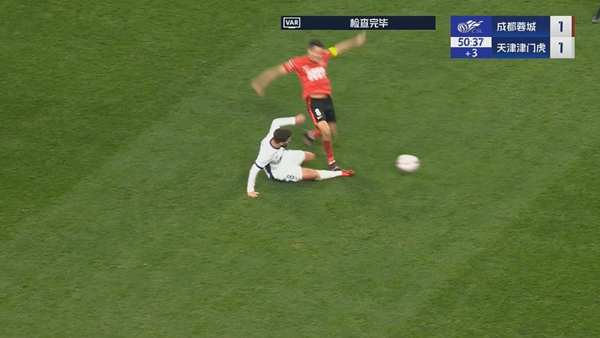【判例二】:中超聯(lián)賽第2輪,成都蓉城VS天津津門虎,比賽第45+3分鐘,成都蓉城8號(hào)隊(duì)員在爭(zhēng)搶球時(shí)疑似踩踏天津津門虎8號(hào)隊(duì)員,裁判員未判罰犯規(guī),VAR介入,裁判員經(jīng)在場(chǎng)回看后,判罰成都蓉城8號(hào)隊(duì)員嚴(yán)重犯規(guī),并向其出示紅牌罰令出場(chǎng)。