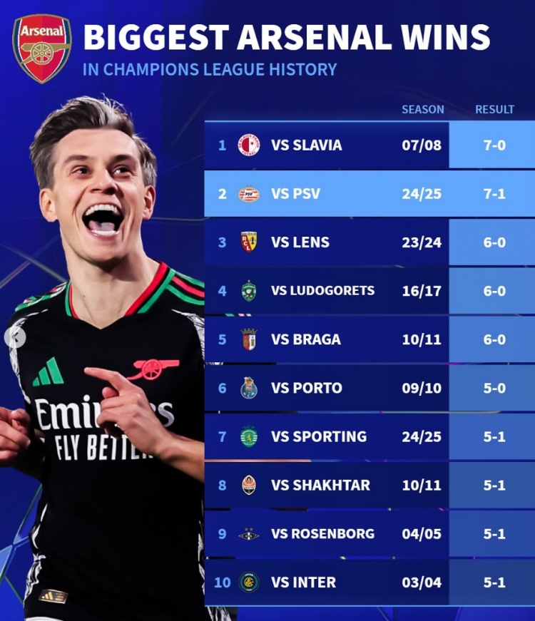 德轉(zhuǎn)列阿森納隊(duì)史歐冠單場(chǎng)大勝榜:
