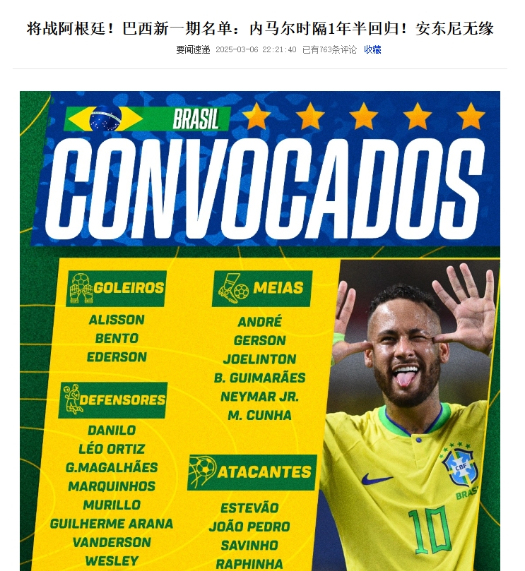 - 世體:內(nèi)馬爾重返巴西國(guó)家隊(duì),拉菲尼亞將讓出10號(hào)球衣