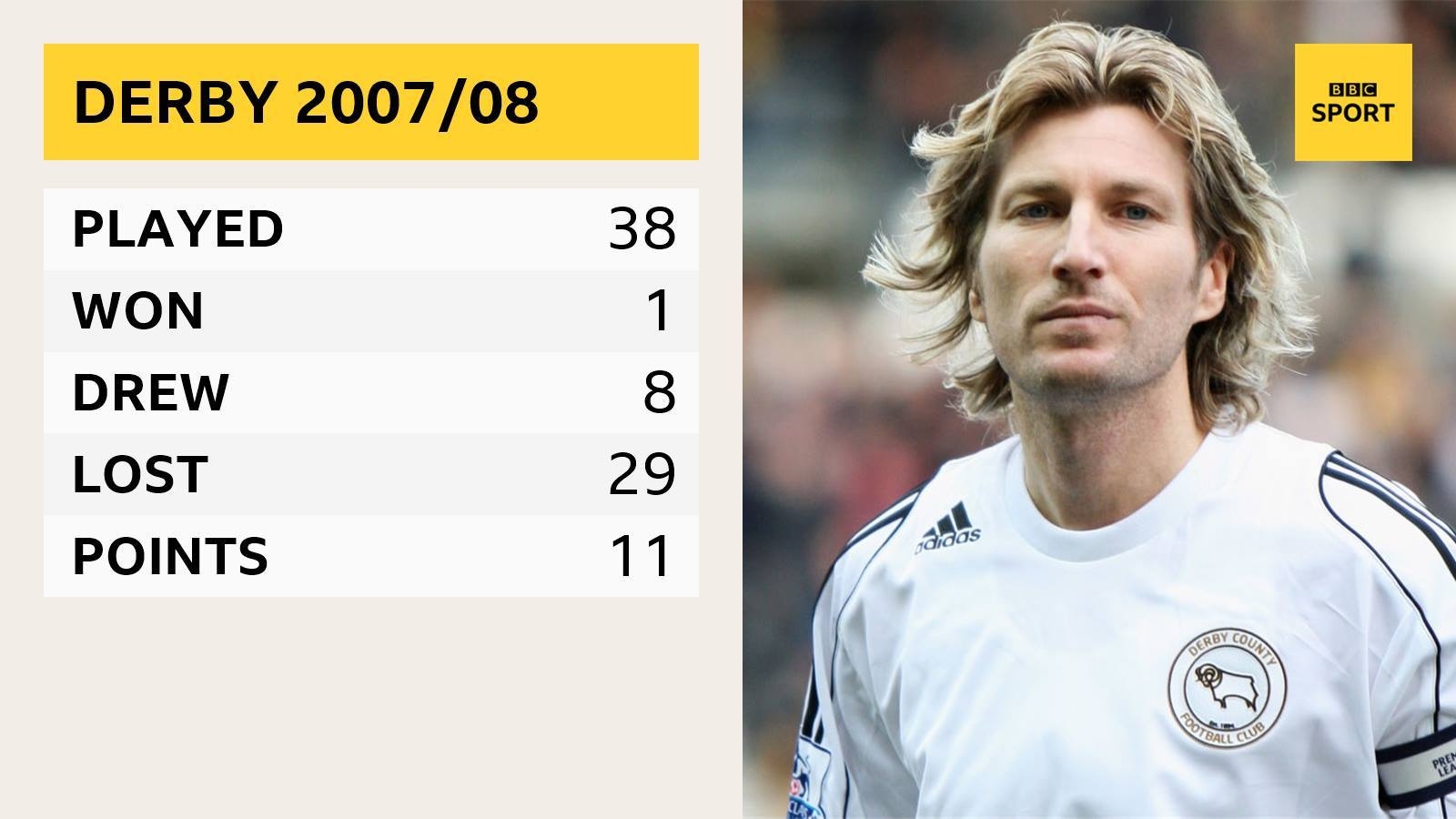 - 難以超越!2007/08賽季,德比郡在英超整賽季拿了11分
