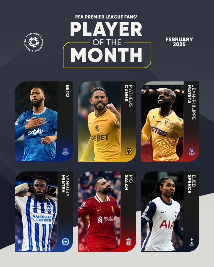 3月5日訊 PFA(英格蘭職業(yè)球員工會(huì))公布英超2月最佳球員候選名單,獲提名的球員為貝托、庫(kù)尼亞、馬特塔、明特、薩拉赫、斯賓塞。