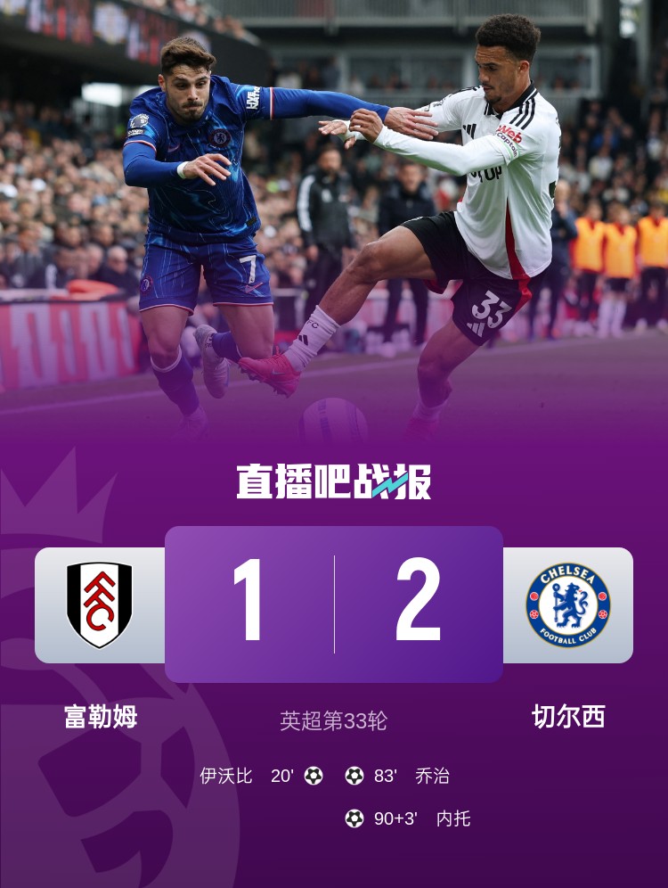 切爾西2-1絕殺富勒姆,喬治破門,內(nèi)托第93分鐘絕殺。