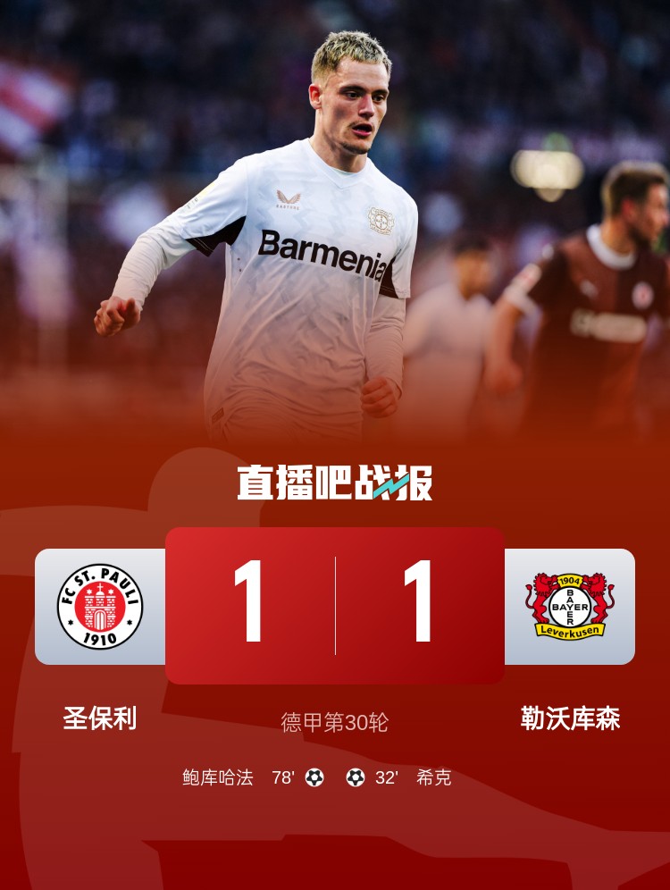 勒沃庫森1-1戰(zhàn)平圣保利,凱恩的首冠越來越近了!