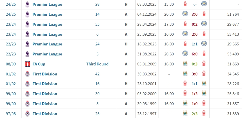 諾丁漢森林上一次在聯(lián)賽擊敗曼城還是在1997年12月,當(dāng)時他們在英甲3-2戰(zhàn)勝曼城。而上一次諾丁漢森林在英超聯(lián)賽擊敗曼城則已經(jīng)要追溯到近30年前。