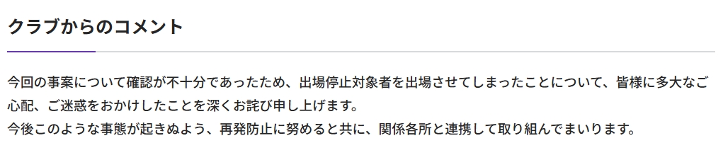 處罰公告發(fā)出后,廣島三箭俱樂部也發(fā)布聲明確認(rèn)該處罰,并且也回應(yīng)了一則簡短的聲明。
