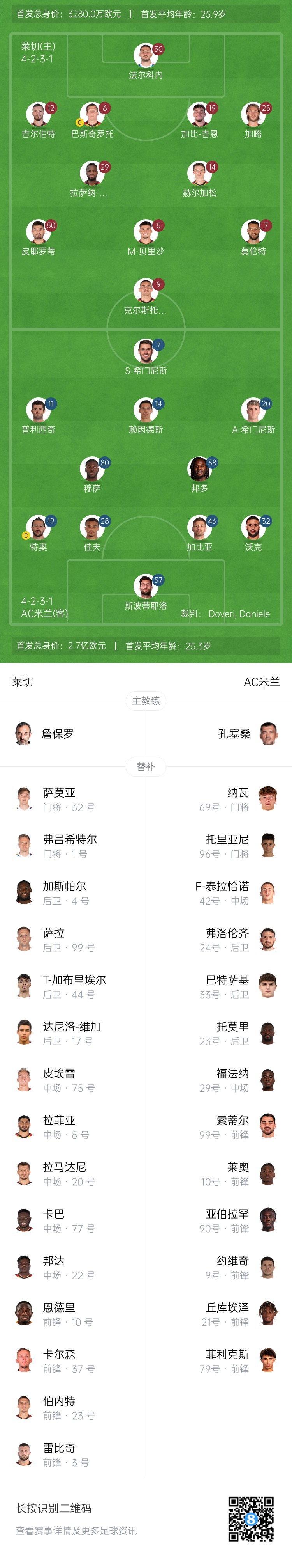 萊切替補(bǔ):32-薩莫亞、1-弗呂希特爾、4-加斯帕爾、99-薩拉、44-T-加布里埃爾、17-達(dá)尼洛-維加、75-皮埃雷、8-拉菲亞、20-拉馬達(dá)尼、77-卡巴、22-邦達(dá)、10-恩德里、37-卡爾森、23-伯內(nèi)特、3-雷比奇