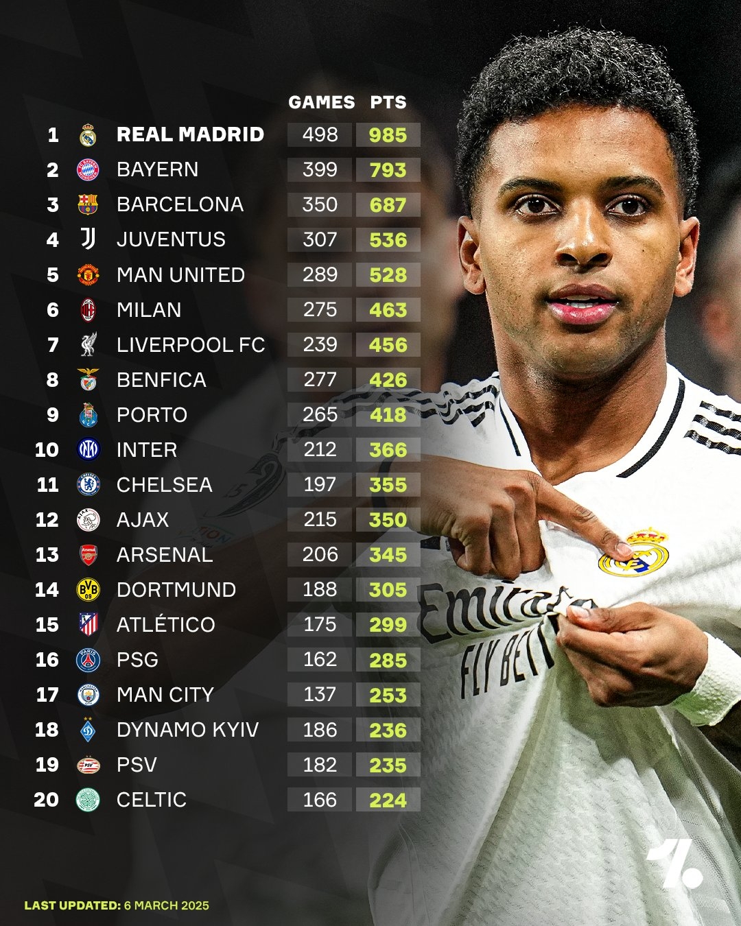 在OneFootball公布的歐冠歷史積分榜上,皇馬以498場(chǎng)比賽積985分的成績高居榜首,拜仁399場(chǎng)積793分排在第二位,巴薩350場(chǎng)比賽687分位列第三。