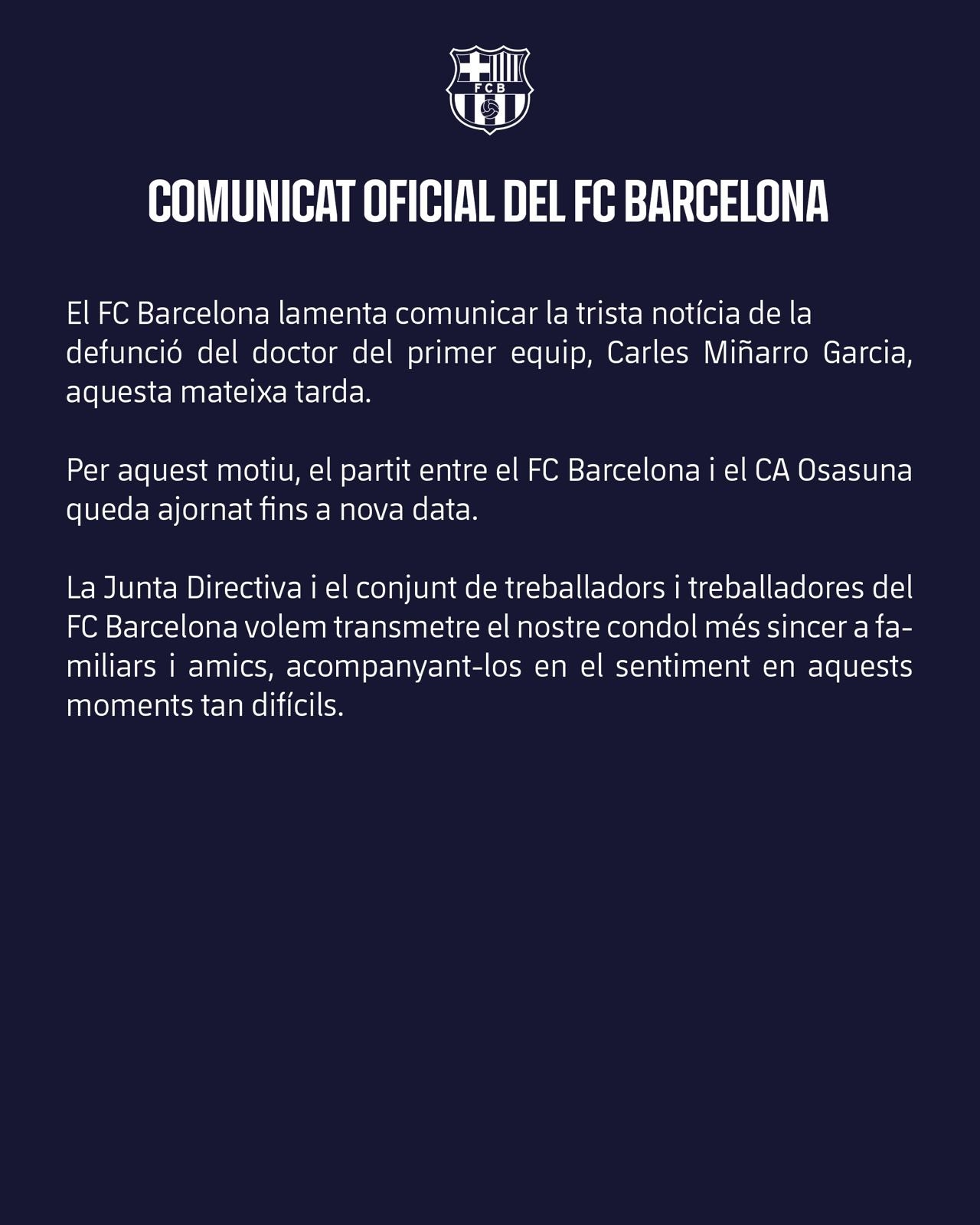 巴塞羅那官方消息,因?yàn)橐痪€隊(duì)隊(duì)醫(yī)去世,原定于凌晨4:00進(jìn)行的巴薩vs奧薩蘇納的比賽推遲,擇日進(jìn)行。